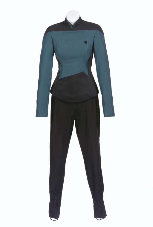 A black and blue/green <I>The Next Generation</I> third season-style Starfleet uniform jacket and pants, two jackets, two pants, one jacket with <I>Paramount</I> label inside inscribed <I>McGate</I> -- worn by Gates McFadden as Dr. Beverly Crusher on <I>Star Trek: The Next Generation</I>; with three corresponding wardrobe tags (4) |