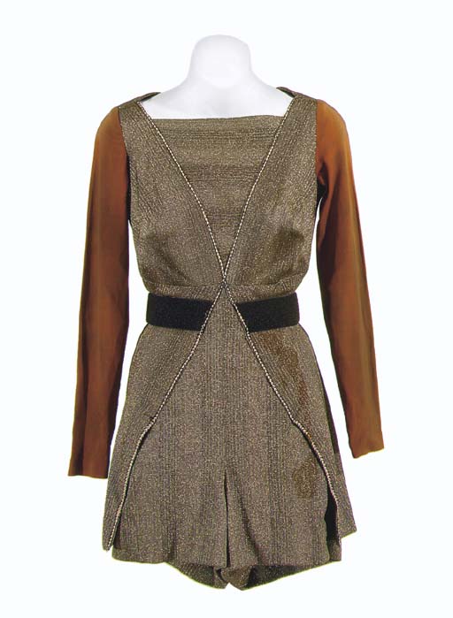 A minidress made from black and gold metallic fabric and faded colored sleeves -- made for a background performer as a female Klingon warrior in "Day of the Dove" in <I>Star Trek: The Original Series</I>, similar to Mara's costume in the same episode |