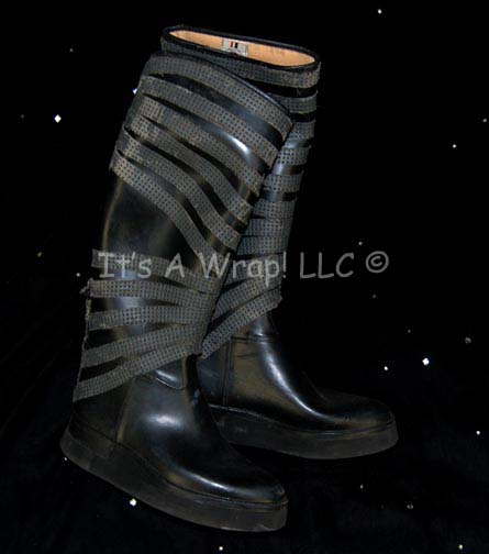 A pair of boots in the style used by Klingon characters featured variously in Star Trek episodic television. These boots are knee high, black, rubber boots with gray rubber detail wrapped around them and raised soles. A size label on the inside reads 10. |