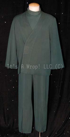 A costume similar to those featured in the first Star Trek featured film but alter for use in later feature films. This costume consists of a sleeveless, dark-green undershirt with a collar ribbed in a horizontal orientation instead of the usual vertical, a zip down the back, a matching, long-sleeved … |