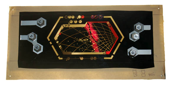 A medium sized smoked acrylic computer interface panel with a translucent application on the reverse made to be back lit when set into a console piece and features a series of metallic silver applications with adhered plastic buttons. When back lit the item reveals a depiction of the ‘Briar Patch', … |