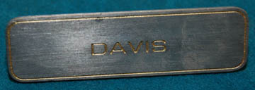 A prop item featured in the sixth Star Trek feature film “The Undiscovered Country”. It is a rounded, rectangular name badge in a metal color with gold colored accents and the name “Davis” engraved in it and measures approx. 2.5 X 1 X 1 inches. |