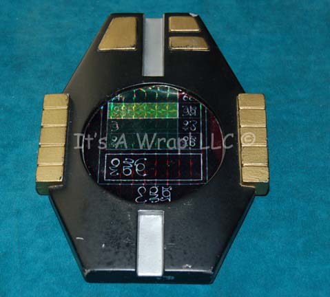 A prop PADD (Personal Access Display Device) featured in various episodes of Star Trek: Enterprise. The item is molded plastic with a backlit graphical application affixed to its display ‘screen' depicting circuitry with numeric values. The item is activated by depressing an internal button with a small pin-like instrument (not … |