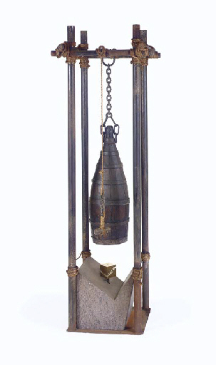 A prop ceremonial gong, the nonfunctional gong of distressed wood gores and metal straps suspended with chain links in an aged tube iron frame with polished gold-tone metallic accent piece -- <I>80x27x27in.</I> -- used in T'Les' home set on planet Vulcan, featured in T'Pol's wedding scene at the end of … |