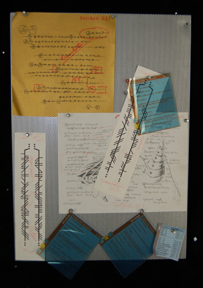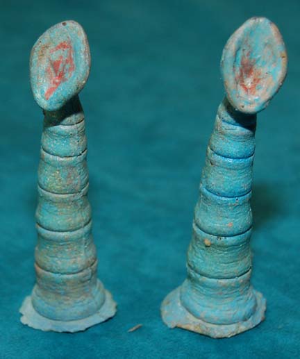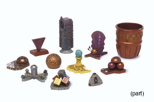 Twenty-seven hand-made alien game pieces featuring fanciful designs, and four alien "dice" and one dice cup, pieces -- <I>2in. high</I> -- featured as playing pieces in the Wadi game of Chula in "Move Along Home" in <I>Star Trek: Deep Space Nine</I> (32) |