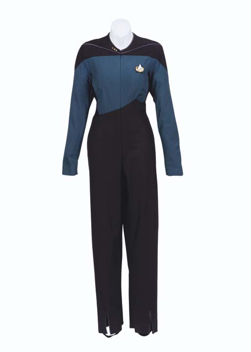 A black and blue/green <I>The Next Generation</I> first season-style Starfleet uniform jumpsuit, includes collar rank pips and Starfleet communicator emblem, with <I>Star Trek: The Next Generation</I> label inside inscribed <I>Miss G McFadden</I> -- worn by Gates McFadden as Dr. Beverly Crusher on <I>Star Trek: The Next Generation</I> |