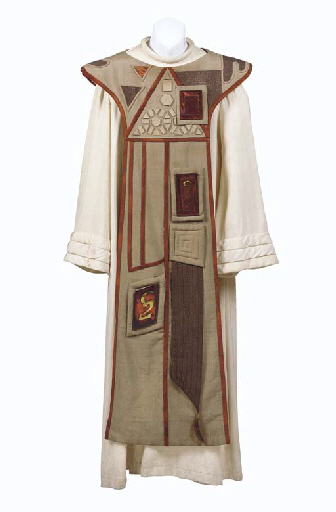 A cream-colored long-sleeved linen robe with long beige tabbard with orange piping, and geometric appliques, including resin-and brass simulated stone decorations in the Vulcan style -- worn by one of the Vulcan masters in the Kohlinahr scene in <I>Star Trek: The Motion Picture</I>, with corresponding wardrobe tag |