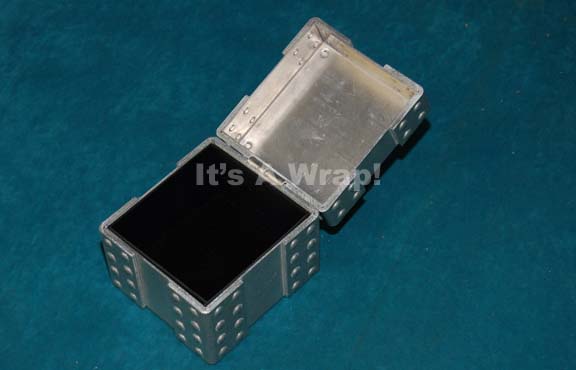 A set dressing box like those found in crew quarters sets of the “Enterprise NX-01” in episodes of Star Trek: Enterprise. The item is a brushed aluminum box with a hinged lid and multiple faux bolt accents externally with a hinged lid. When opened, a black felt lining is present. … |