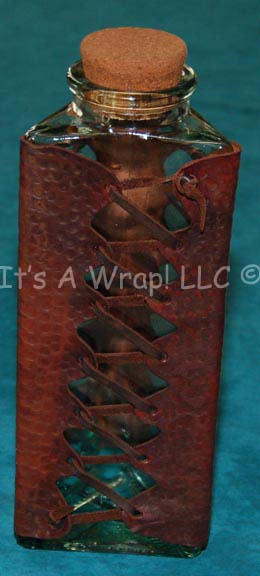 An interesting leather covered bottle like the one appearing in the “Shinzon Screen Test” segment on the special features disk of the Star Trek X: Nemesis DVD set. The item is a blue tinted glass bottle, triangular shaped, with a wide top and a cork, the exterior of the bottle … |