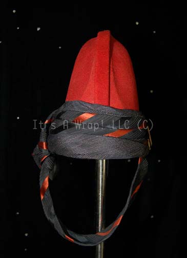 A costume element of the style featured in “Search for Spock” and “The Voyage Home” as well as variously in Star Trek episodic television. A rust-colored, Vulcan-style hat featuring raised black trim and chinstrap with rust-colored stripes; further trim in soft black and gold pinstripes. On the side of the … |
