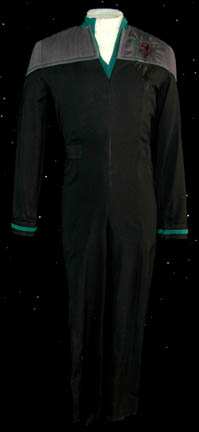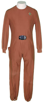 A brown Starfleet ‘Class-D' uniform jumpsuit with sewed on Starfleet emblem on a gold backing indicating the wearer to be part of the ‘operations division’ with an affixed ‘bio-monitor’. The legs feature Velcro and clasps for a form fitting appearance, the waist has an open top pocket, the costume zips … |