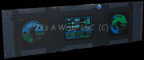 A console panel believed to have appeared in Star Trek feature films. The item is a single sheet of clear acrylic with an adhered blue and green themed graphical application in between. The item depicts a variety of faux buttons, gages, and readouts, one depicted as ‘System Diagnostics’ with a … |