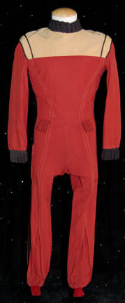 A crewman's uniform of the style appearing in various Star Trek feature films. The costume is a red jumpsuit with black accents and a tan yoke. The costume features an unattached red trimmed black felt placement for an accompanying gold colored band with an affixed silver colored metal commendation bar … |