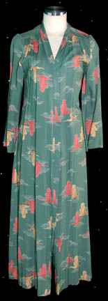 A costume item believed to have been worn by Nichelle Nichols and was found in the Star Trek feature films, “Uhura” section. The item is a long-sleeved, full-length green robe featuring multi-colored avian designs, further white accents and pleating around the shoulders. |