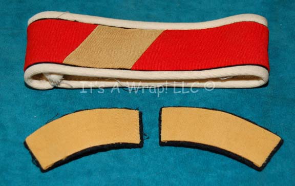 A set of Starfleet crewman trainee’s division strips appearing in Star Trek VI: The Undiscovered Country. The item is trainee red fabric with an engineering yellow intention flash centered, both bordered by white trim. A pair of shoulder strips are also present made from black felt with yellow fabric affixed. |