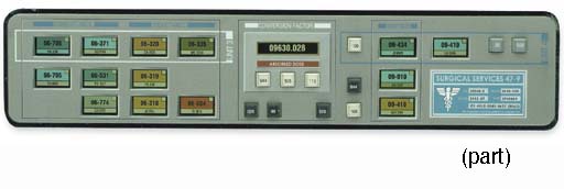 Two prop backlit control panels, each made from smoked acrylic plastic with <I>NX-01</I>-style inkjet vinyl control surfaces, and surface-mounted simulated buttons and switches, cutout areas in the vinyl reveal graphics designed to be backlit and is labeled "Surgical Services" -- <I>20x4½in.</I> -- from a control console used in the sickbay … |