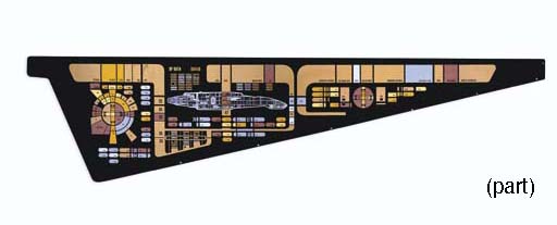 Two triangular starship control panels made from smoked acrylic plastic with a large-format Kodalith film with LCARS-style Starfleet control graphics and hand-cut colored lighting gels and diffusion, graphic includes schematic diagrams of <I>Deep Space Nine</I>'s <I>Starship Defiant</I> -- <I>18x72in.</I> -- used in the engine room set of the <I> Defiant</I> … |