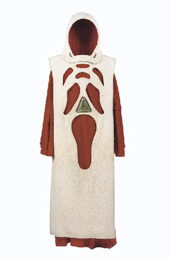 A flowing red robe with cream-colored tabbard and hood -- worn by a Vulcan priest standing behind Dame Judith Anderson in the Fal-tor-pann sequence of <I>Star Trek III: The Search For Spock</I> |