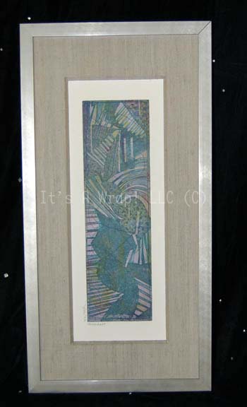 A piece of modern art appearing variously on the set of “Admiral Forrest’s” (Vaughn Armstrong) office in episodes of Star Trek: Enterprise. The item is a painting, matted with a pea green fabric inside a brushed metal frame. The item is suitable for hanging and a label on the reverse … |