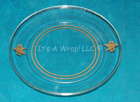 A clear glass plate altered for set use in Star Trek episodic television or feature films. The item is a round glass plate with two circles of metallic gold colored decal inside the inner rim and a pair of Starfleet emblems mirroring one another in the style appearing after the … |