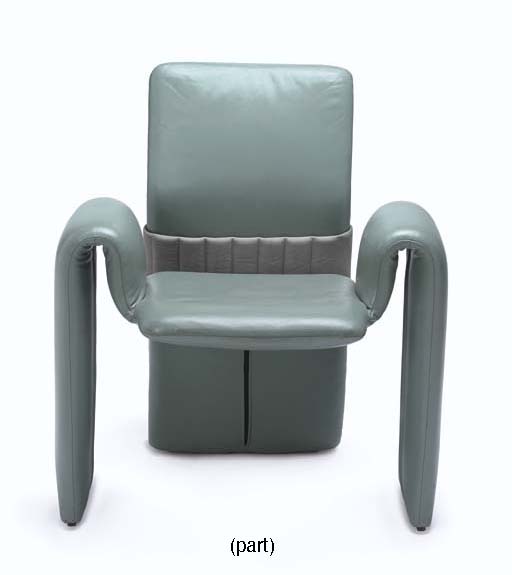 Two curvilinear armchairs covered in green imitation leather -- <I>33in. high</I> -- used as set dressing in several sets on <I>Star Trek: Voyager</I> (2) |
