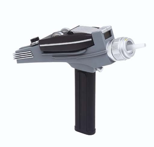 A <I>Star Trek: The Original Series</I>- style phaser pistol prop, modified from an Art Asylum injection-molded plastic toys, with two strips of Velcro adhered for attachment to Starfleet uniform pants -- <I>8½in. long</I> -- worn by Scott Bakula on Jonathan Archer's costume in "In A Mirror, Darkly, Part II" in … |