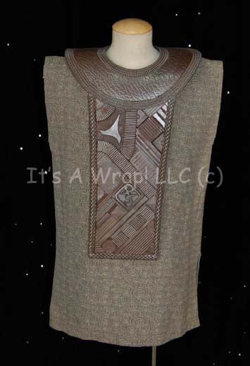A lot of costume elements featured in the sixth Star Trek feature film “The Undiscovered Country”. A large sleeveless, gray tunic featuring a textured, circular pattern stitched in white and worn underneath one of two ceremonial tabard/armors. The first is a large molded rubber costume embellishment that covers the entire … |