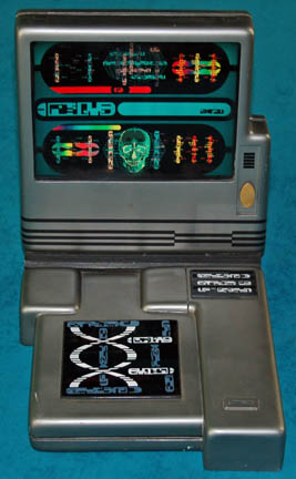 This 24th century prop computer was built in the Starfleet style and features an LCARS (Library Computer Access and Retrieval System) backlit screen. The screen depicts a humanoid skull and diagrams in multi-colors. The body of the computer is made of resin painted silver with a tilting upper section. Attached … |