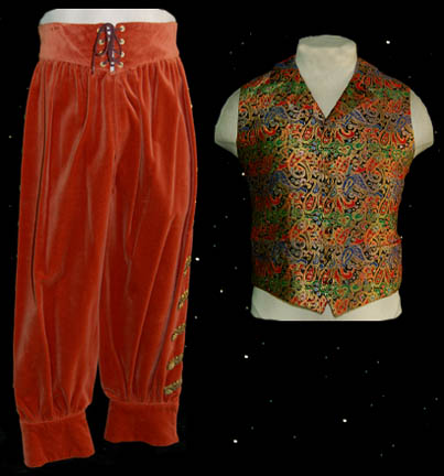 This costume was featured in the Star Trek: Voyager episode “Sacred Ground”. It has a tan tunic with ruffled sleeves, pleats up the front and back and an attached sash that snaps at the side. Matching tan trousers accompany the tunic, as does a braided belt with tassels. Costume comes … |
