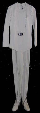 A gray Class-A Starfleet uniform featured in Star Trek I: The Motion Picture for wear by Persis Khambatta in her portrayal of “Lieutenant Ilia”, the Deltan navigator. The costume is a set of trousers with attached shoes and attached negligee and a matching uniform top with an attached plastic bio-monitor … |