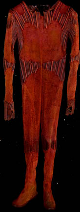 A costume made for wear by John Fleck in the role of the treacherous Suliban “Silik”; it is a full-length, long-sleeved rust colored jumpsuit with various rubber accents across the shoulders, around the elbows, cuffs, knees, and waist; thumb holes cut into the cuffs, a thin, brown, neoprene-like lining sewn … |