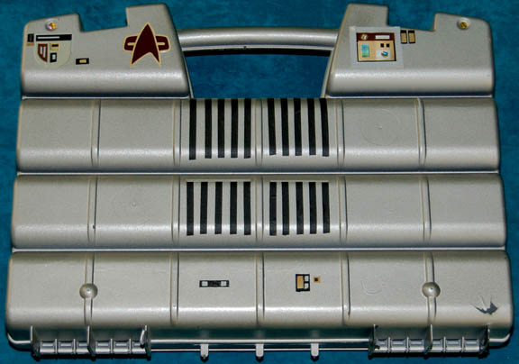 A prop item similar to those featured variously throughout 24th century, Star Trek episodic television. This item is a prop carrying case in molded, silver-colored plastic featuring graphical applications of black detailing, the “post-Generations” Starfleet emblem, various multi-colored accents made to emulate some kind of electronics; a Starfleet inventory sticker … |