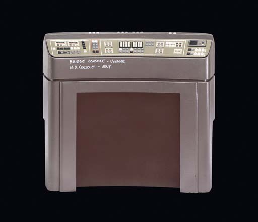 A prop control console with simulated buttons in <I>NX-01</I> style, inscribed in paint marker <I>Bridge console - Voyager, N.D. console - Ent.</I> -- <I>47x42in.</I> -- this console was originally used on the bridge of the <I>Starship Voyager</I>, then it was refurbished for service aboard Archer's ship in <I>Star Trek: Enterprise</I> … |
