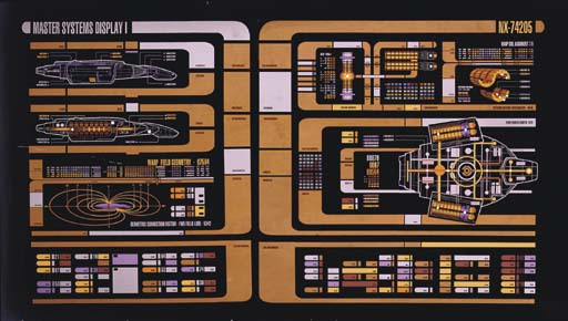 A prop starship status display panel made from smoked acrylic plastic with a large-format Kodalith film with LCARS-style Starfleet control graphics and hand-cut colored lighting gels and diffusion, graphic includes schematic diagram of <I>Deep Space Nine</I>'s <I>Starship Defiant</I> -- <I>38x68in.</I> -- used in the engine room set of the <I>Defiant</I> … |