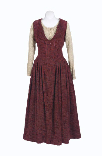 A sleeveless dress of burgundy wool with cream knit undershirt, both with <I>Star Trek: The Next Generation</I> label inside inscribed <I>Marina Sirtis</I>, and a green skirt -- all worn by Marina Sirtis as Deanna Troi while in disguise among the proto-Vulcan villagers on planet Mintaka III in "Who Watches the … |