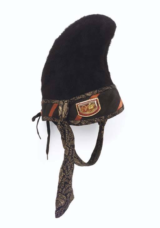 Two formed felt hats with elongated domes in the Vulcan style, one rust colored, one black, both with resin simulated stones and gold-painted Vulcan symbols -- used by background performers in <I>Star Trek III: The Search For Spock</I> and <I>Star Trek IV: The Voyage Home</I> (2) |