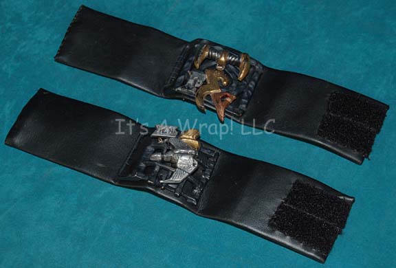 A pair of amazing Klingon costume bracelets created for Star Trek feature films or episodic television. The items are black leather with size adjusting Velcro placements and sewn on metal embellishments. One features an affixed costume icon like those appearing on uniform sleeves with a molded metal iconographic phrase with … |