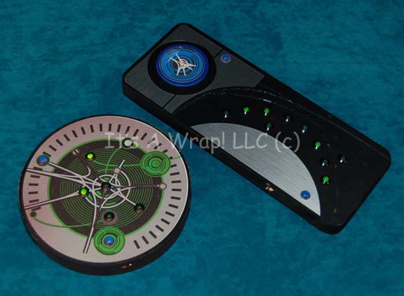 A pair of Xindi themed console controls featured in episodes of Star Trek: Enterprise. The items are made from sheet plastic on fashioned micro-density fiber wood with embedded lights and faced with graphical applications. The display graphic on the round item is paper with Xindi readouts and iconographic lettering, the … |