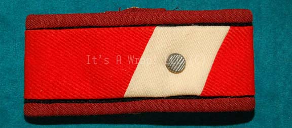 A costume division strip corresponding to a Starfleet crewman uniform like those appearing in Star Trek feature films. The item is a black felt backing with a trainee red fabric division coloring affixed that features a command white intention flash, trimmed by red. The intention flash features a silver colored … |