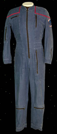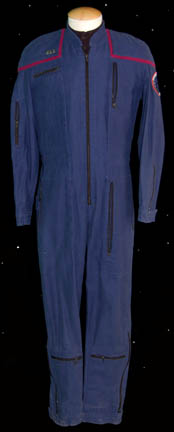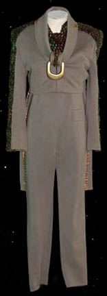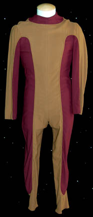 A costume featured in various episodes of Deep Space Nine. This costume is a full-length, long-sleeved tan jumpsuit featuring magenta-colored accents along the inside of the sleeves, down the ribs and outer part of the legs; a zip up the back and stirrups for the feet. The costumer's tag reads … |