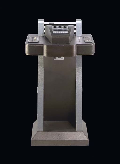 A small freestanding prop <I>NX-01</I>-style control console with three simulated control levers and prop control buttons -- <I>26x42in.</I> -- used as the cargo transporter control console during the first three seasons of <I>Star Trek: Enterprise</I> until the transporter was upgraded in "Daedalus" in <I>Star Trek: Enterprise</I>; in different forms, this … |