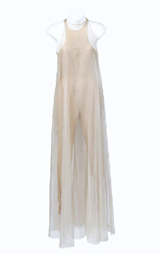 A sheer nylon gown, a flesh-colored body suit, headdress and Vulcan necklace of brass and cast resin -- worn by one of the "Vulcan virgins" in the Fal-tor-pann sequence of <I>Star Trek III: The Search For Spock</I> (3) |