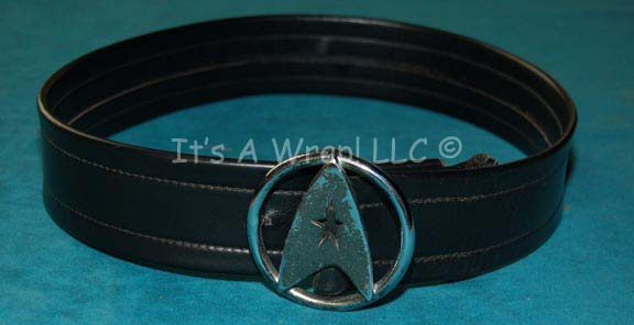 A rare Starfleet crewman's belt made from black leather with a practical silver colored metal Starfleet logo buckle made for wear with a variety of Starfleet crewman’s costumes. Belts like this appeared in various Star Trek feature films like Star Trek II: The Wrath of Khan, and Star Trek VI: … |