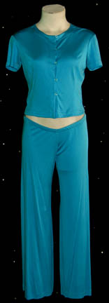 A costume featured in various episodes of Star Trek: Enterprise like “The Xindi” for wear by “T'Pol” (Jolene Blalock). This two piece light blue button front shirt and pants features a sheen due to its synthetic fabric and appeared on screen during scenes in which “Commander Tucker” (Connor Trinneer) arrived … |