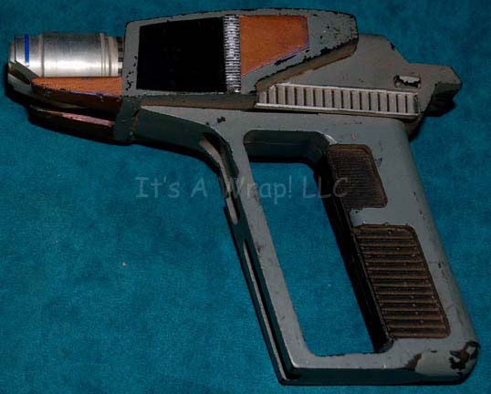 A prop item similar to those featured in various episodes of Star Trek episodic television. A gray, resin cast pistol featuring black, textured accents around the hand grip, black and copper-colored detail, and a metal barrel muzzle. The item measures approx. 7 X 5.5 X 2 inches. |