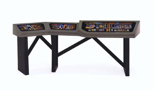 A prop control console, made of wood painted grey with untested backlit black acrylic plastic simulated control surfaces and LCARS-style Starfleet graphics of Kodalith film and hand-cut colored lighting gels -- <I>92x35x21in.</I> -- originally made for <I>Star Trek: Deep Space Nine</I>'s <I>Starship Defiant</I> bridge set |