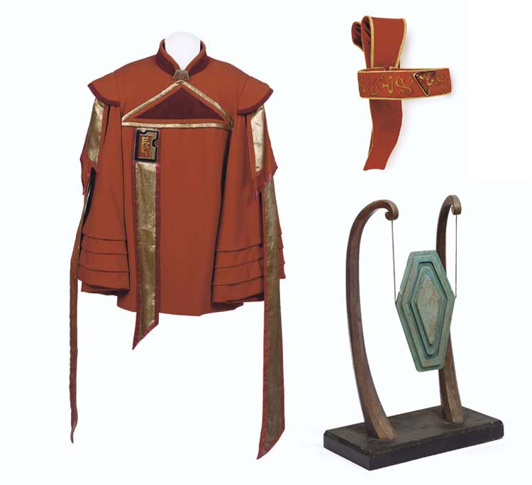 An orange jacket with mandarin-style neck with gold and burgundy trim in the Vulcan style, decorated with resin Vulcan jewelry, with orange and gold headband inscribed with Vulcan-style lettering, a resin simulated stone and a scale model of the Vulcan gong used in the Fal-tor-pann sequence of <I>Star Trek III</I> … |