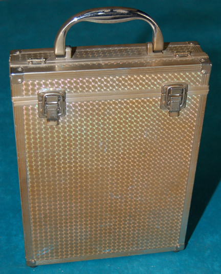 A prop make-up kit box appearing in the Star Trek: Enterprise episode “Acquisition” in the hands of the Ferengi “Muk” (Clint Howard). The item is a carry case with a reflective interior and exterior lining, a lid hinged in two places with flip latches and a swiveling handle. The exterior … |