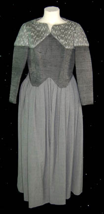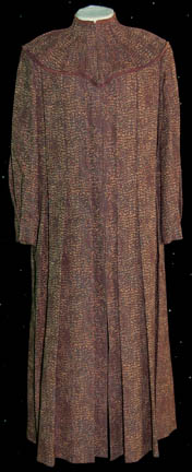 A costume robe featured in the episode “Rightful Heir” of Star Trek: The Next Generation for wear by a Klingon pilgrim in the Boreth Monastery. The costume is a full length zip front robe made with faux reptile pattern fabric, pleated, and featuring brown piping around the shoulders and chest … |