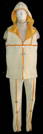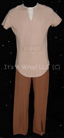A costume featured in Star Trek I: The Motion Picture for wear by characters in sickbay on the “USS Enterprise”. The costume is an extremely soft cream colored sleeveless shirt with matching trousers, both with affixed orange tubing with silver colored clamps at intervals. The top features an affixed hood … |